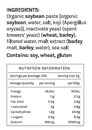 A high-quality product, made from premium ingredients that are naturally packed with umami. Certified organic soybean paste (organic soybeans, water, sea salt, koji (Aspergillus oryzae)), inactive yeast (spent brewer’s yeast), filtered water, malt extract, Olsson’s fine salt.